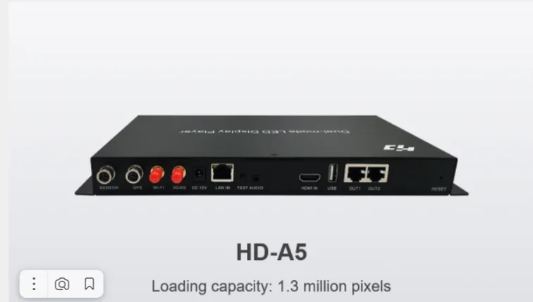 HD-A5 — это двухрежимный проигрыватель со светодиодным дисплеем второго поколения, который поддерживает асинхронное воспроизведение, синхронное воспроизведение, разъем U-диска и функции автоматического масштабирования видео с максимальной нагрузкой 1,3 миллиона пикселей. Поставляется с модулем Wi-Fi, поддерживает управление мобильным приложением. Оснащен 8 ГБ памяти, поддержка расширения памяти с помощью U-диска.Поддержка дополнительного модуля 4G, удаленное управление кластером
